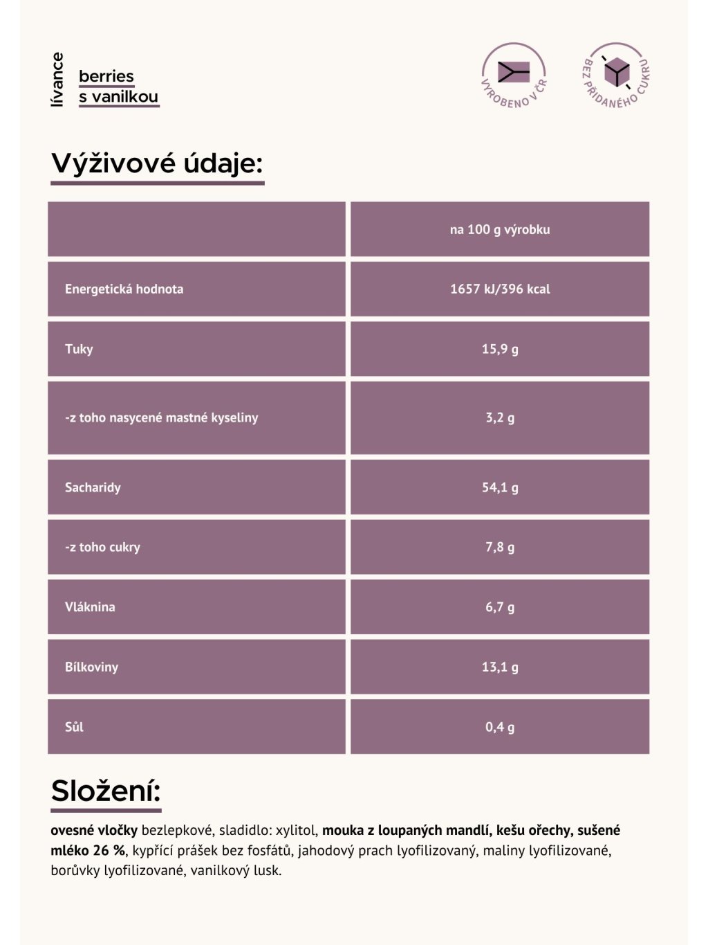 Složení: ovesné vločky bezlepkové, sladidlo: xylitol, mouka z loupaných mandlí, kešu ořechy, sušené mléko 26 %, kypřící prášek bez fosfátů, jahodový prach lyofilizovaný, maliny lyofilizované, borůvky lyofilizované, vanilkový lusk.