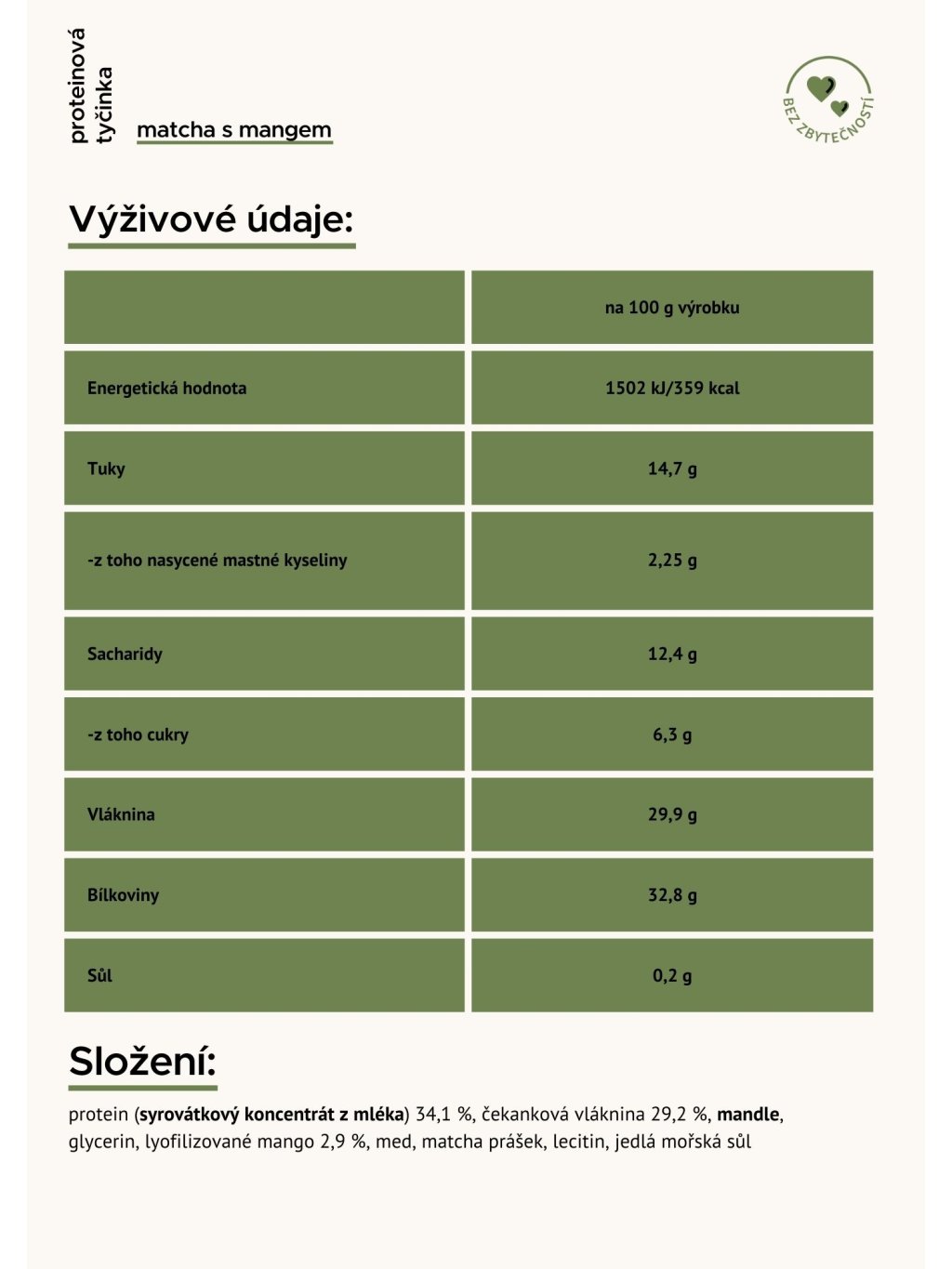 Složení: protein (syrovátkový koncentrát z mléka) 34,1 %, čekanková vláknina 29,2 %, mandle, glycerin, lyofilizované mango 2,9 %, med, matcha prášek, lecitin, jedlá mořská sůl.